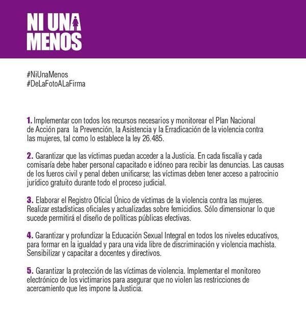 Esta semana se cumplió 5 años del movimiento #niunamenos. Lamentablemente, y a pesar de muchas conquistas que supieron ganar los diversos movimientos feministas, la violencia de género y los femicidios son noticias diarias. Les dejo las 5 consignas presentadas aquel año.