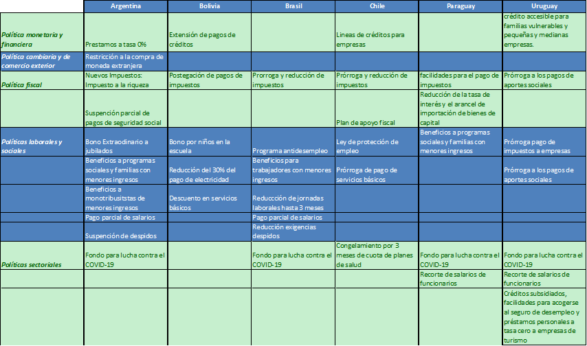 Siguiendo la metodología presentada por la NU. CEPAL (2009), se muestran las medidas implementadas o anunciadas en Argentina, Bolivia, Brasil, Chile, Paraguay y Uruguay, bajo la premisa de agruparlas, de manera esquemática, en las categorías siguientes: