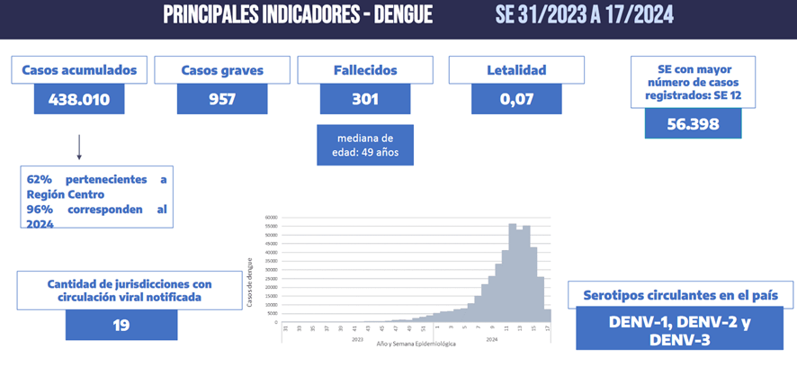 La epidemia de dengue en Argentina se destacó por su comienzo temprano y una duración prolongada de casos. En los primeros 4 meses del 2024, se registraron más de 400 mil casos y 300 muertes. Este brote ha sido en gran medida atribuido al cambio climático, que ha favorecido la proliferación del mosquito Aedes aegypti, así como a la movilidad de personas entre países vecinos que enfrentan brotes epidémicos.