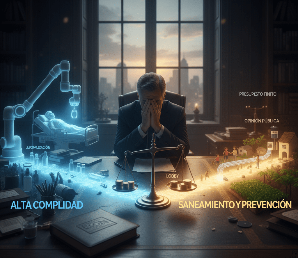 Por otro lado, los colectivos de pacientes y las corporaciones médicas defienden sus parcelas con una intensidad legítima pero financieramente voraz. En este escenario, la salud pública —representada por el saneamiento o la prevención primaria— carece de un grupo de presión propio; no tiene «visitantes médicos» ni campañas publicitarias. El decisor queda así atrapado entre la espada de la judicialización, que obliga a cubrir prestaciones fuera de presupuesto, y la pared de la eficiencia, que exige cuidar la sostenibilidad del sistema. Sin herramientas de Evaluación de Tecnologías Sanitarias (ETS) que actúen como escudo técnico, el sistema se convierte en un barril sin fondo que financia lo que más ruido hace, no lo que más vidas salva.